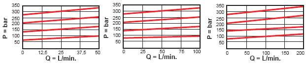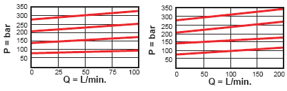 出厂设定压: A, B, C, 及 W 标准设定压 70 bar. N 标准设定压 25 bar. Q 标准设定压14 bar. * 所有调压范围设定压 5 bar. 客户可指定设定压