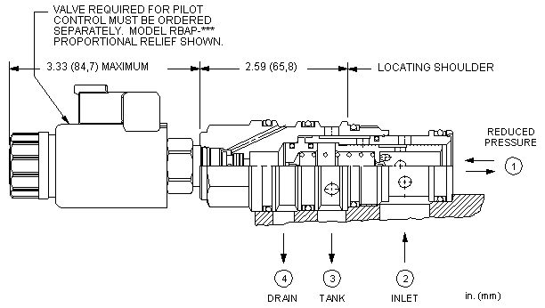 - 外泄口(口4)处的压力直接以1:1的比例增加到阀的设定值上,且压力不能超出5000 psi(350 bar)。