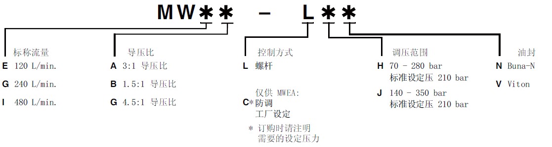 次螺杆顺时针方向旋转到底,则阀的最低设定压力;H 弹簧为 70 bar; J 弹簧为 140 bar