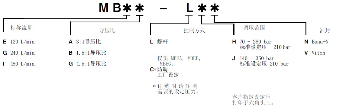 将螺杆顺时针方向旋转到底,则阀的最低设定压力,H弹簧为70 bar;J 弹簧为140bar